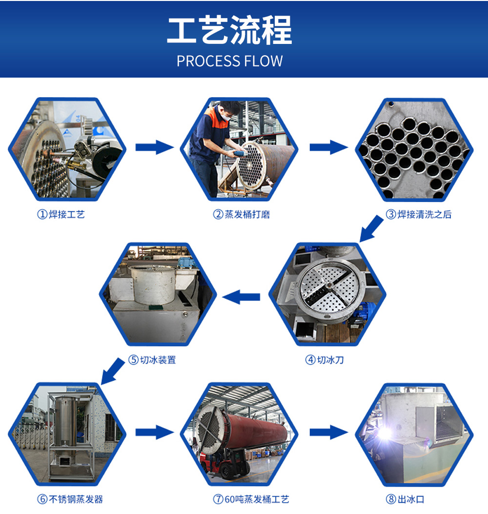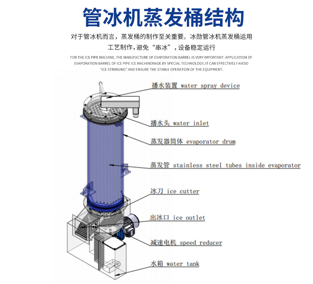 2、管冰機(jī)所有與制冰水接觸部分材質(zhì)均是食用級(jí)材料。 由多根不銹鋼管組成蒸發(fā)器制冷劑在管與管之間流動(dòng),水在管內(nèi)從上往下在分水器的作用下呈螺旋狀流動(dòng), 水在流動(dòng)過程中形成冰。