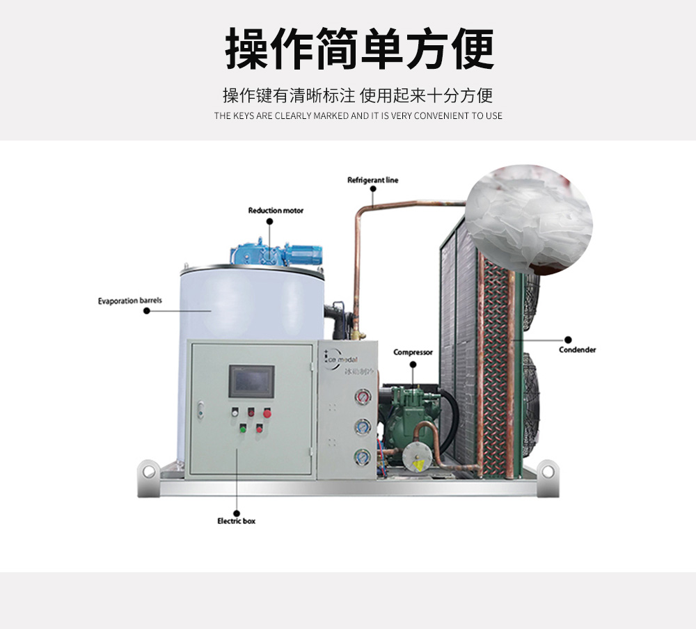 片冰機(jī),制冰機(jī)的一種,片薄、干爽疏松狀的白色冰。平面形狀不規(guī)則,厚度15毫米 —22毫米,直徑約為12 - 45毫米。 片冰質(zhì)地干燥、柔軟無(wú)尖銳棱角,不會(huì)刺傷冷凍物體。冷藏包裝過(guò)程中其扁平的外型將盡可能避免傷害到被冷藏物,對(duì)被包裝食品起到保護(hù)作用。 片冰具有大接觸面積、快速制冷、儲(chǔ)藏運(yùn)輸便捷、減少熱交換,保持冰的溫度等特點(diǎn)。自動(dòng)片冰機(jī)采用先進(jìn)的立式螺旋刀切冰式蒸發(fā)器,制冰時(shí)由冰桶內(nèi)部的分水裝置將水均勻的分灑至 冰桶內(nèi)壁快速結(jié)冰,冰成型后由螺旋冰刀切冰落下。