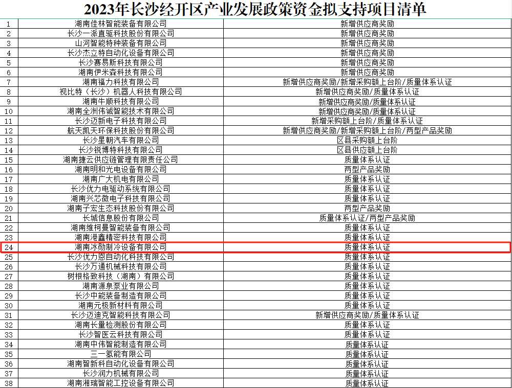 近日,長(zhǎng)沙經(jīng)濟(jì)技術(shù)開(kāi)發(fā)區(qū)公布了關(guān)于2023年長(zhǎng)沙經(jīng)濟(jì)技術(shù)開(kāi)發(fā)區(qū)產(chǎn)業(yè)發(fā)展政策資金擬支持項(xiàng)目的公示,湖南冰勛制冷設(shè)備有限公司榜上有名。
